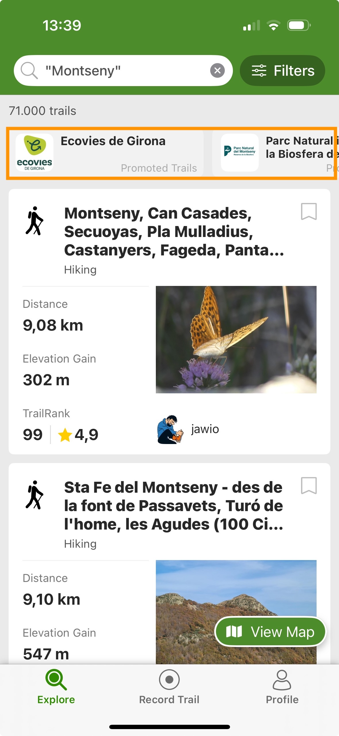 - Explore tab: You'll see their profile highlighted at the top of the search results under the name Promoted trails: